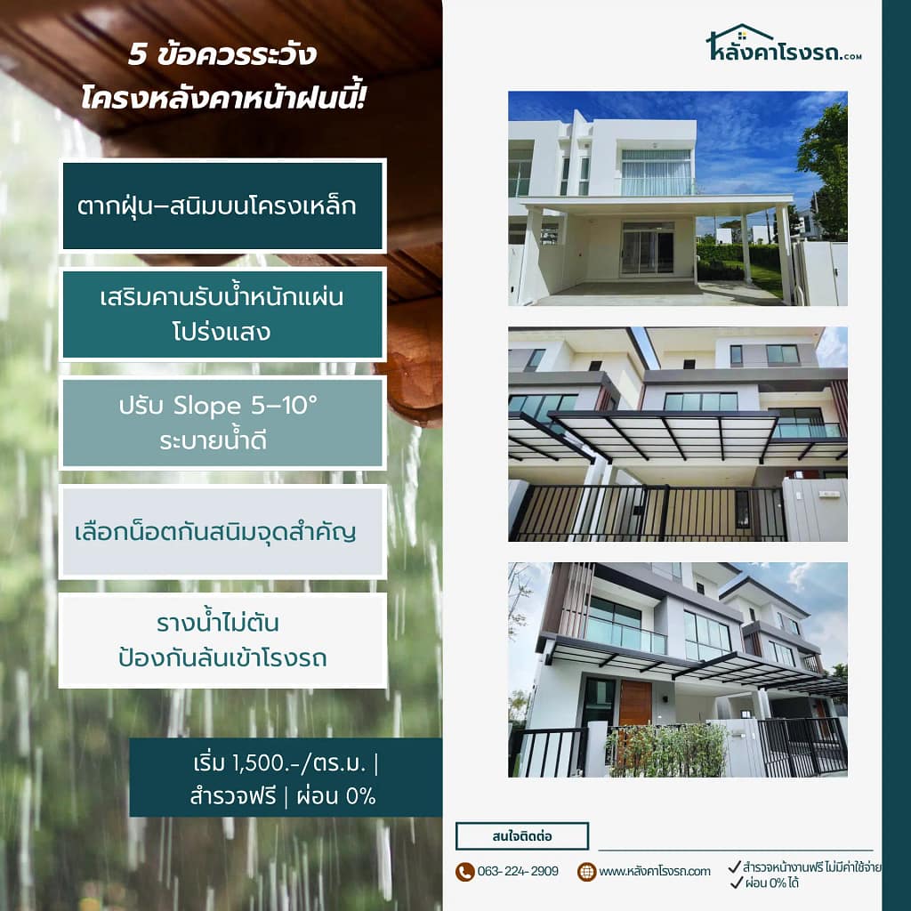 5 ข้อควรระวังโครง หลังคาโรงรถ หน้าฝน “หลังคาโรงรถ” เป็นองค์ประกอบสำคัญที่เจ้าของบ้านไม่ควรมองข้าม เพราะนอกจากจะช่วยปกป้องรถยนต์และทรัพย์สินจากแดดฝนแล้ว ยังเสริมภาพลักษณ์ของตัวบ้านให้ดูเรียบร้อย น่าอยู่ และทันสมัย การเลือกหลังคาที่ดีควรคำนึงถึงวัสดุ ความทนทาน การระบายความร้อน และเสียงรบกวนจากฝนตก